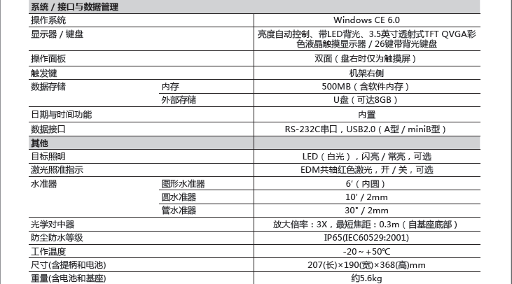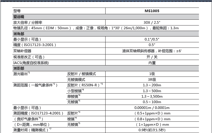 符合《測繪資質(zhì)分級(jí)標(biāo)準(zhǔn)規(guī)定(2014)》中“大地測量”及“工程測量”甲級(jí)認(rèn)證標(biāo)準(zhǔn)對(duì)高精度全站儀的要求。
